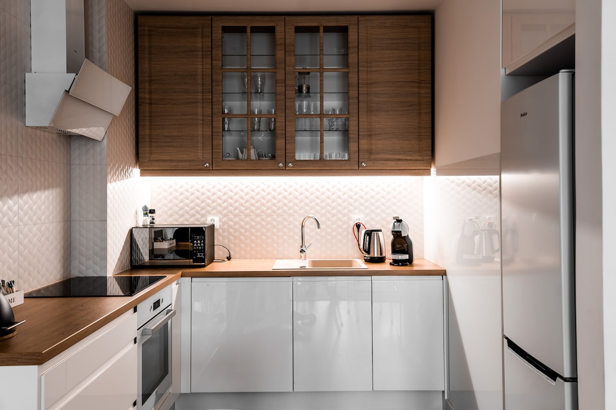 High standard studio, 28 m² with private bathroom, close to the center. There is a gas station and a market nearby. The studio consists of a spacious living room with kitchenette and bathroom. In the living room, there is a corner sofa bed (when unfolded 200 x 140 cm) and elegant ecru feather bedding. Modern equipment: 50" TV, induction hob, set of pots, fridge, washing machine, hair dryer. An additional advantage is the balcony, ideal for relaxation.