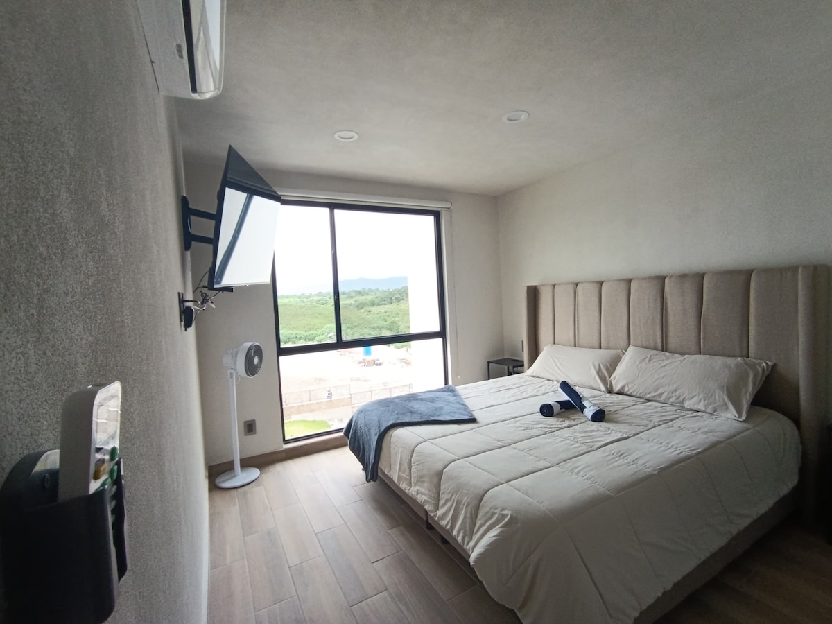 Enjoy incredible family days in a furnished industrial loft-style house, within a residential development located in Xochitepec, Morelos. It has: • 2 bedrooms, each with a double bed, plus one of the bedrooms has a sofa bed • Living room, TV • Kitchen equipped with necessities. • Garden with barbecue grill. • Private pool • Mosquito nets, ceiling fans, and air conditioning. • Parking. • 24-hour surveillance • Internet. The area is quiet and easily accessible