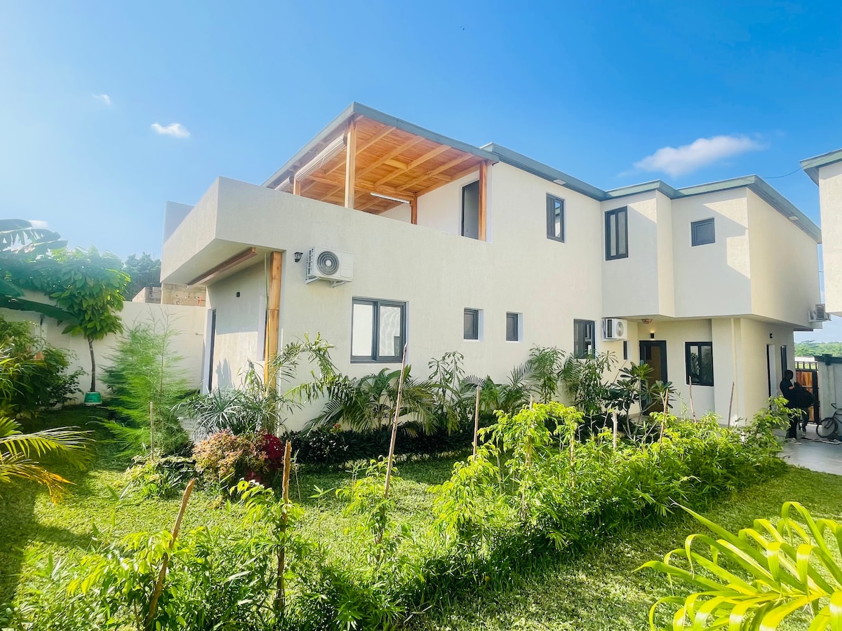 Have fun with the whole family in this very chic accommodation. - 3 independent bedrooms with air conditioning and 43" smart TV - 1 large living room with 55" smart TV and 1 dining room, with air conditioning - 1 secondary living room upstairs with 43" smart TV and access to a large balcony (for your aperitifs and evenings outdoors) - Fully equipped kitchen - FTTH 200 Mb/s internet access - Generator - 1m³ water tank with suppressor