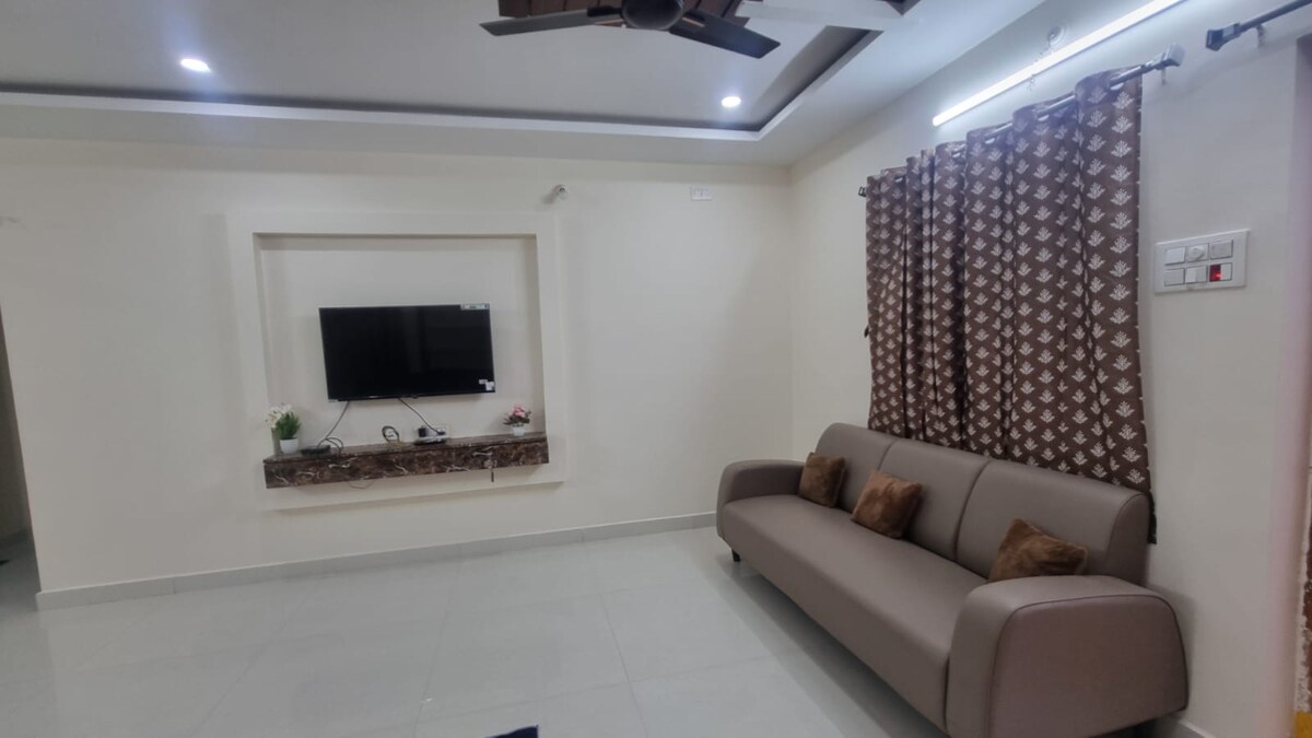 Welcome to your perfect spacious & peaceful 1 BHK Flat on 2nd floor to accommodate 3 guests. NOTE: There is NO LIFT This modern house offers a comfortable and stylish stay in the heart of the city Hyderabad. Enjoy the spacious kitchen and dining area. This home is designed for comfort and convenience with easy access to city. Book your stay today for a relaxing experience! Key Features: 1 bedroom & bathroom, kitchen & dining, Living Room with Sofa Bed, Smart TV, Wifi, CCTV, front Patio