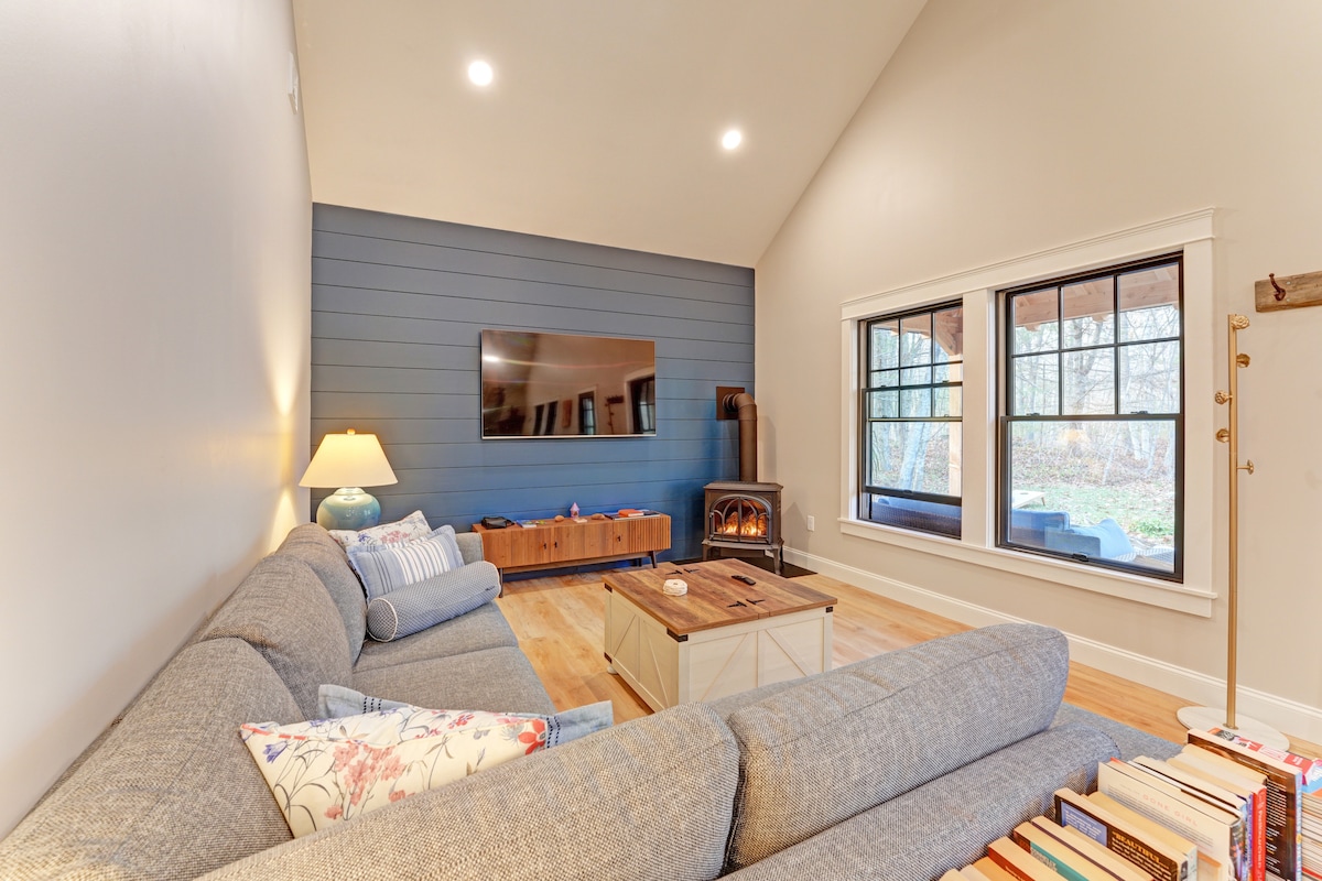 • Perfect for small families or couples, our signature A-Frame cabin features a modern interior gas burning fireplace, soaring ceilings, huge windows, stylish interiors, and all the comforts of home. • This cozy 1,100 square foot space comfortably accommodates up to four guests in two bedrooms (one with a King-size bed and the other with a Queen-size bed) and a shared bathroom. • 7 minute drive to downtown Freeport. • Proud to be ranked in the top 1% and voted Guest Favorite!