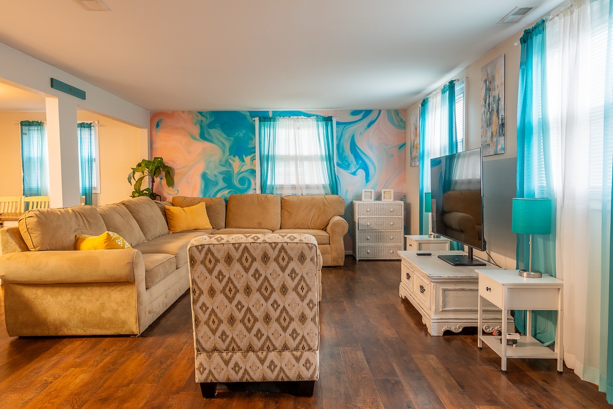 Live like a star in this pristinely remodeled home designed to provide a five-star lifestyle without breaking the bank. Featuring an oversized communal kitchen for groups & families. Sleeps 10 and has all the creature comforts any traveler could imagine. A cozy outdoor area to watch the sunset, BBQ by day or toast marshmallows by night. The crown jewel is the entertainment room featuring an infrared sauna, karaoke machine, 65" smart TV & games galore. Your every desire has been anticipated.