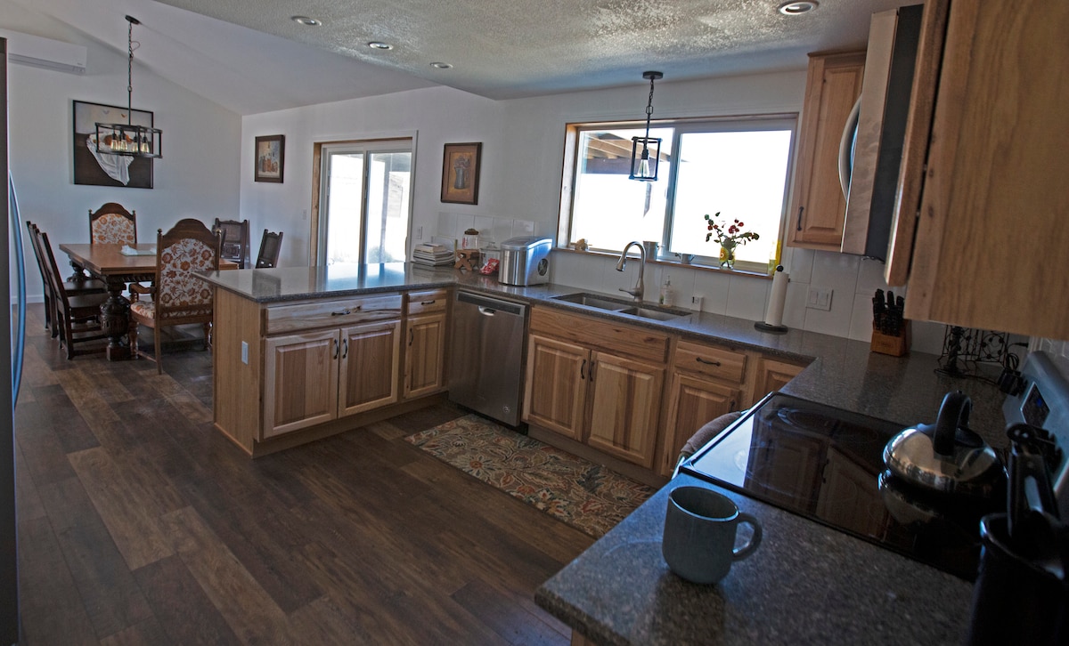 Up the hill from J T lake campground, very near W. Entr. of JT Nat. Park. Up above J T-city lights twinkling as you relax on the spacious back patio enjoying mountain views, absolute silence and clean air and the beautiful starry sky. Serenity has natural travertine stone floors, SS kitchen appliances & cookware incl. garb. disp. & D/W, ref. W/D. 6’ bath 6’ tall shower. 2 mem. foam futons in LR fold out for add. sleeping. Lge. windows in the LR & BR & 2 in the bath for clean nat. light.