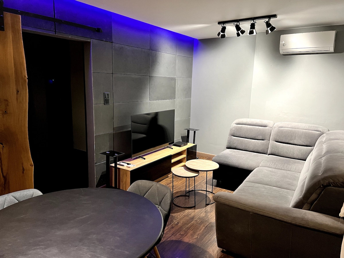 "Na Zicher" is a brand new apartment (90m2) located in the luxurious Browar Lubicz complex, 10 minutes by walk from the cloth hall. Garage parking (1) is included in the price of the stay. There is a 70m patio and a balcony, a large living room with a kitchenette and a table, two fold-out sofas, 2 bathrooms, 2 bedrooms - one completely independent and the other with an additional part with a sofa. Vintage- style decorated. For Families, groups or couples :) For you!