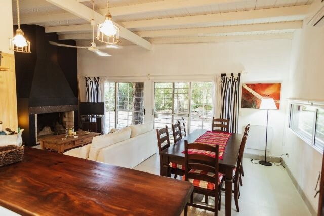 This unique home has plenty of space for you to enjoy with your group. Its large windows give the rooms an exceptional view, full of light and greenery. Its layout gives each guest their independence while converging in the spacious living-dining room with fireplace and integrated kitchen. Wifi and Direct TV. Hot/cold A/C in all rooms. Large outdoor gallery. It has a portable grill. Access to club activities, golf, polo, pool, restaurant, private beach.