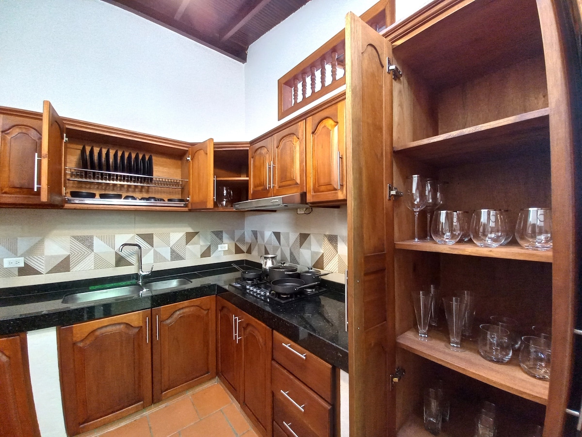 Country house in a gated community, surrounded by nature where you can rest in a safe and comfortable environment. Our colonial-style house, featuring traditional architecture, is the winner of Colombia's architecture biennial. The house has two bedrooms, which comfortably accommodate up to four guests. The charm of the tapia pisada walls and handmade furniture is combined with contemporary amenities to create a cozy atmosphere.