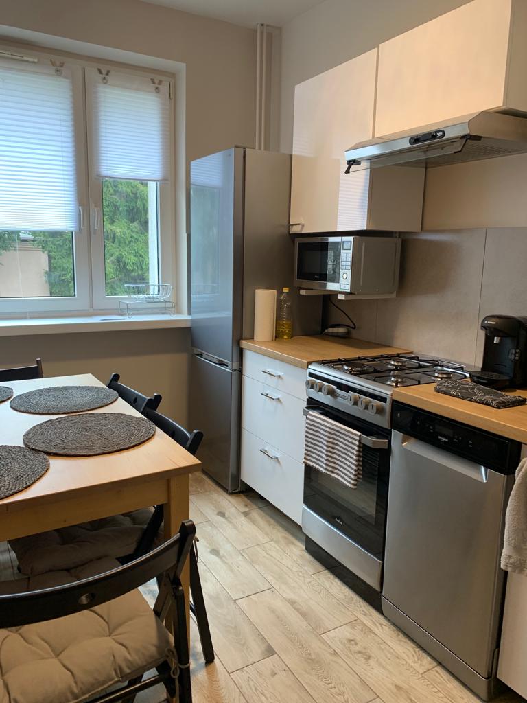 Cozy room with a balcony and a sofa bed, a bedroom, a furnished and equipped kitchen, a bathroom, a toilet and a hallway with a wardrobe. The apartment is suitable for short and long-term stays. The apartment can comfortably sleep 3 adults or 2 adults and 2 children. You can park your car on the street if available. Next to the block there is a playground for children. The apartment is located at 9m3 Biedronkowa Street, block 104, on the 1st floor. The block has 4 floors and no elevator