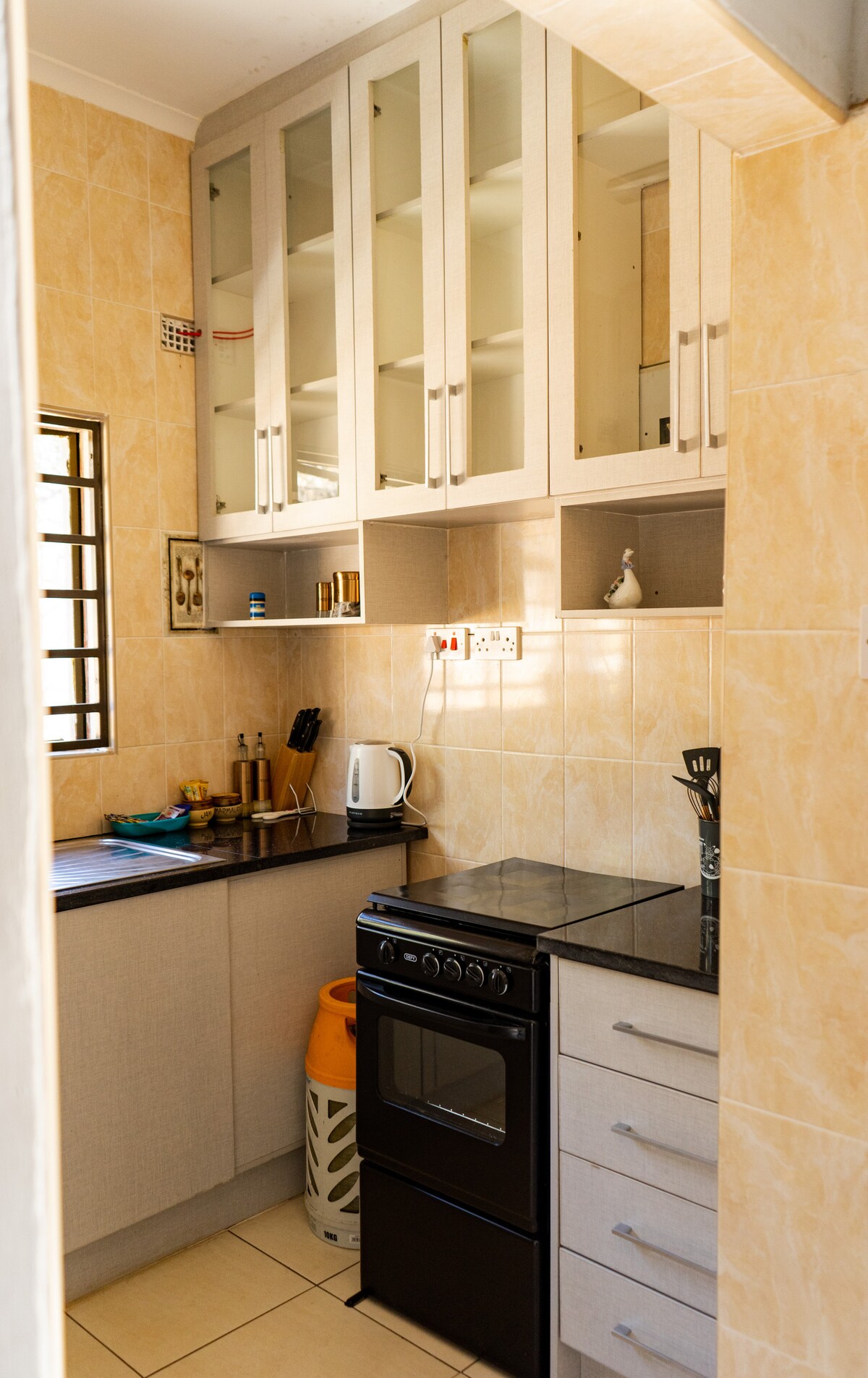 Situated about 7km from the city centre, this beautiful self contained 1 bedroomed apartment is situated in a quiet area of Burnside. Razor wire, eletric gate and own remote. This comes with free parking, private wi-fi, fully equipped kitchen, flat screen TV , backup solar system, geyser and borehole.. About 3 km from the guest house are the famous Hillside dams and 25km from the World's View, Matobo National Park popularly known for the Matobo Hills, balancing rocks and many more.