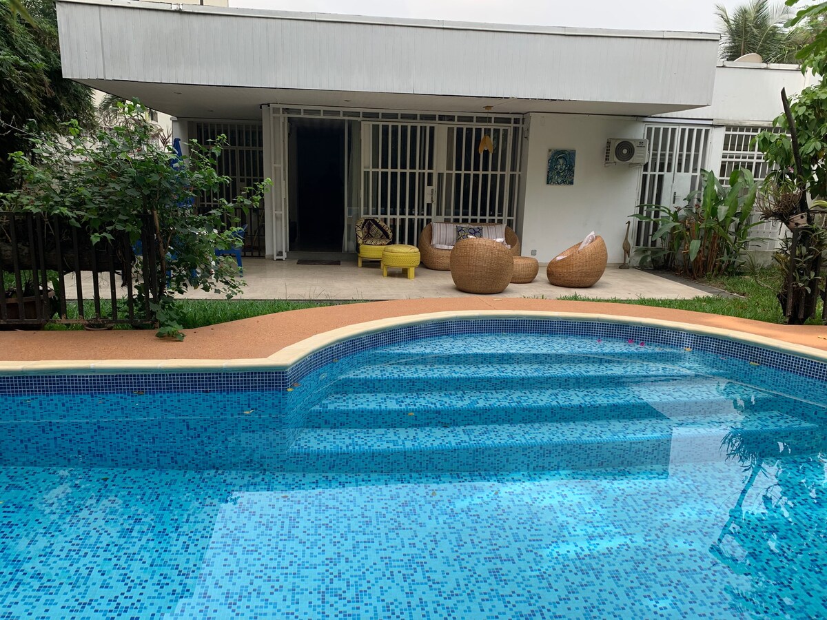 Maison HAKA is a family home located in the "Vieux Cocody", not far from the Lycée International Jean Mermoz. This changing neighborhood remains colorful and authentic. Our house is easy to access and close to all amenities (supermarket, small restaurants, pharmacy, market, etc.) with the advantage of being away from major roads. Finally, a code lock secures access (code canceled after each departure). The location is strategic and your travels will be made easier.
